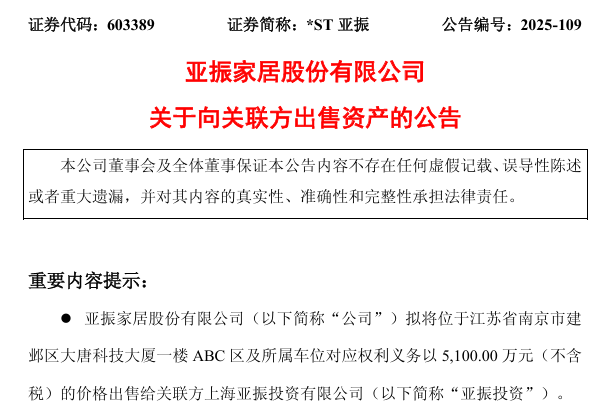 12月1日,正处于“披星戴帽”状态的亚振家居股份有限公司(简称:亚振家居)发布了一则资产出售公告,计划将位于江苏省南京市建邺区的一处商业房产及所属车位,以5100万元(不含税)的价格出售给关联方上海亚振投资有限公司。此举被公司解释为“盘活资产,回笼资金”,以改善流动性。