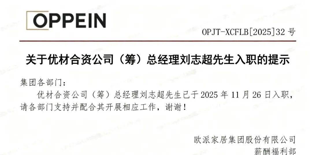 近日,欧派家居集团股份有限公司(简称“欧派家居”)内部正式发文,宣布资深经理人刘志超已于11月26日回归集团,并出任旗下“优材合资公司(筹)”总经理。这位曾先后效力于欧派、索菲亚、顾家等头部企业的行业“老将”,在离开数年后重返老东家并担纲关键新业务的掌门人,这一任命被业界普遍解读为欧派家居在深化供应链整合、强化板材及新材料战略布局方面落下的重要一子。