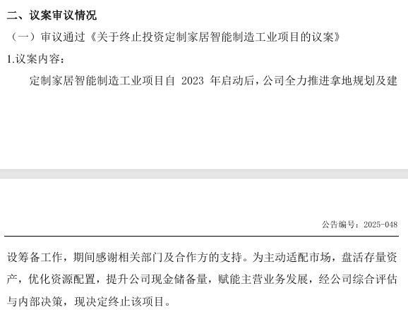 公告中明确解释,终止决定是为“主动适配市场变化,盘活存量资产,优化资源配置,提升现金储备量,进而赋能主营业务发展”。这一表态具有清晰的战略逻辑:从行业看,定制家居市场竞争日趋激烈,大规模产能扩张面临需求波动风险;从企业自身看,已形成的智能制造体系和柔性生产能力能够支撑当前业务需求,2025上半年经营活动现金流量净额同比大增1439.37%的数据,更为其优化资源配置提供了充足底气。