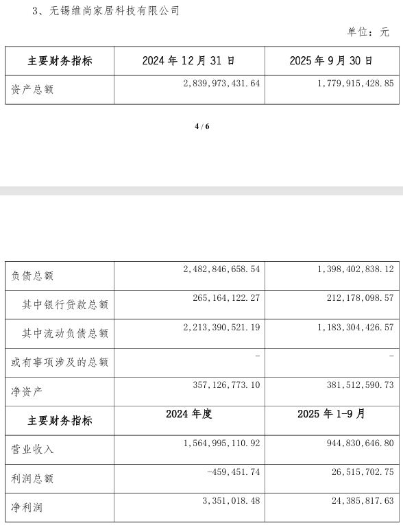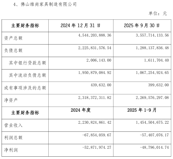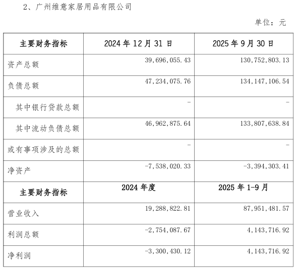 从经营数据来看,除广州维意、无锡维尚在2025年前三季度实现微弱盈利外,其余两家子公司均处于亏损状态,反映出业务普遍面临压力。值得关注的是,截至今年三季度末,广州维意的净资产为负数。