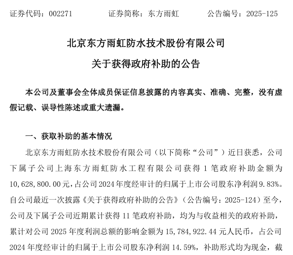 值得注意的是,这是东方雨虹今年内密集披露的最新一笔政府补助。据公司梳理,自其最近一次(编号2025-124公告)披露至今,公司及下属子公司近期累计获得11笔政府补助,均为与收益相关、以现金形式发放,实际收款总额为1578.49万元。该笔合计补助预计将对公司2025年度利润总额产生同等金额的正向影响,占2024年归母净利润的14.59%。