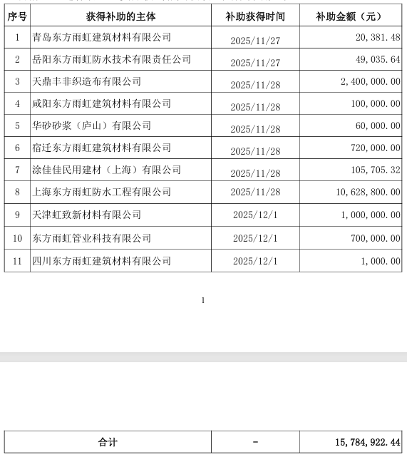 国内建筑防水材料龙头企业东方雨虹再次收到政府补助。公司12月2日发布公告称,其下属子公司上海东方雨虹防水工程有限公司获得一笔金额为1062.88万元的政府补助,该笔补助金额占公司2024年度经审计的归属于上市公司股东净利润的9.83%。