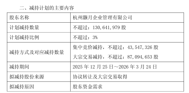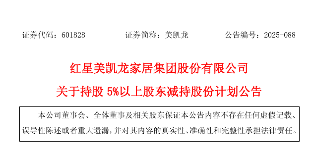 12月3日,红星美凯龙家居集团股份有限公司(简称:美凯龙)于2025年发布公告,披露公司持股5%以上股东杭州灏月企业管理有限公司计划在未来三个月内减持公司股份不超过1.31亿股,占公司总股本的3%。若按公告日收盘价每股2.64元测算,此次减持套现金额预计约为3.45亿元。减持原因为“股东资金需求”,股份来源为协议转让及大宗交易取得。