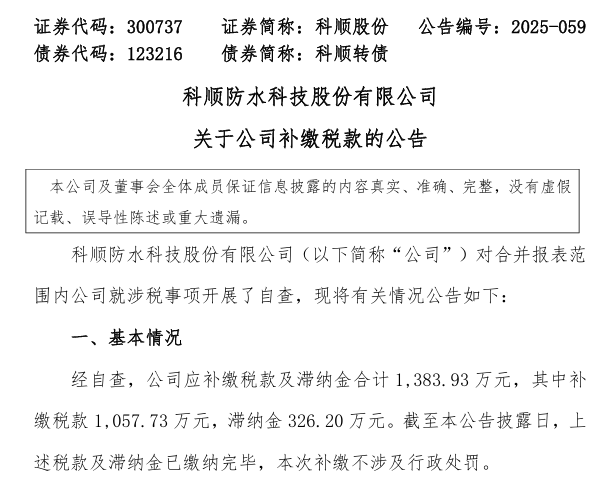 12月5日,科顺防水科技股份有限公司(简称“科顺股份”)发布《关于公司补缴税款的公告》。公告称,经自查,公司需补缴税款及滞纳金合计约1383.93万元,其中包括税款1057.73万元和滞纳金326.20万元。截至目前,相关款项已全部缴纳完毕,且此次补缴未涉及行政处罚。