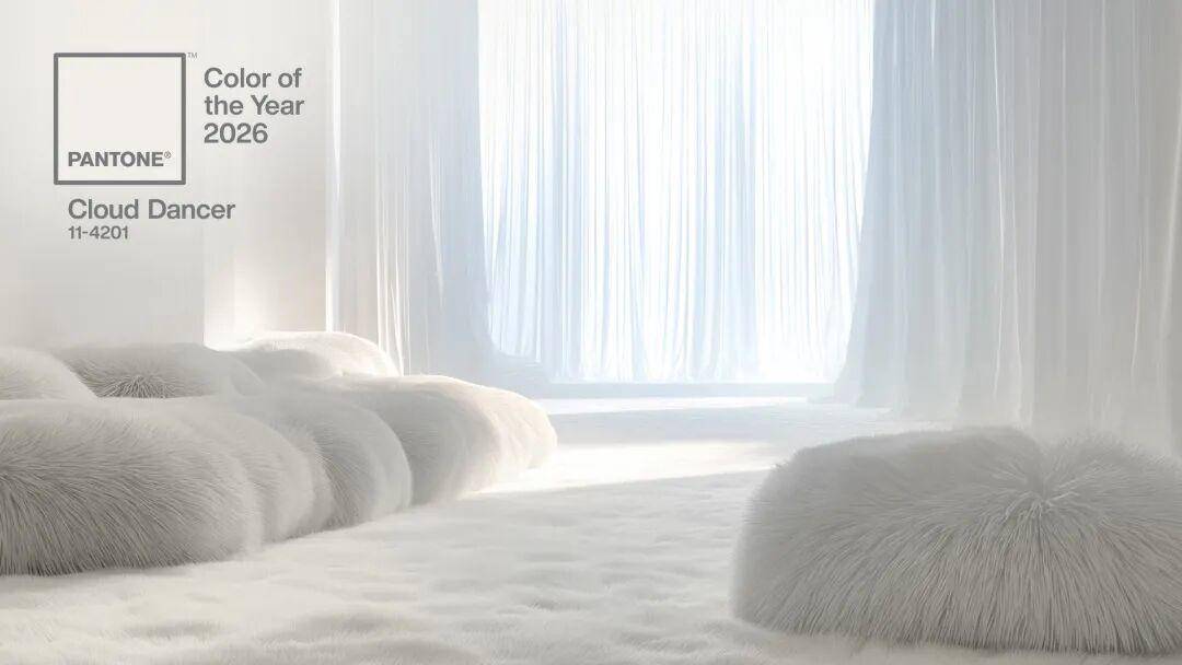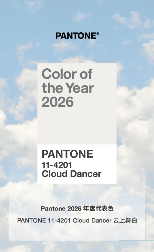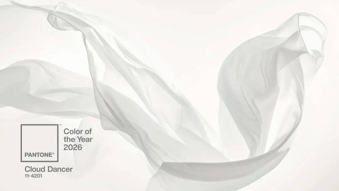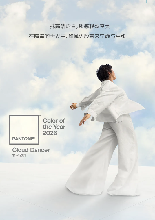 12月4日,全球色彩权威机构Pantone(潘通)正式宣布,PANTONE 11-4201 Cloud Dancer(中文定名为“云上舞白”)当选为2026年度代表色。这一轻盈通透、带有微妙光泽的白色,被潘通视为当前社会文化情绪与时代精神的视觉表达,回应着人们在喧嚣世界中日益增长的对于专注、宁静与内心安定的渴望。