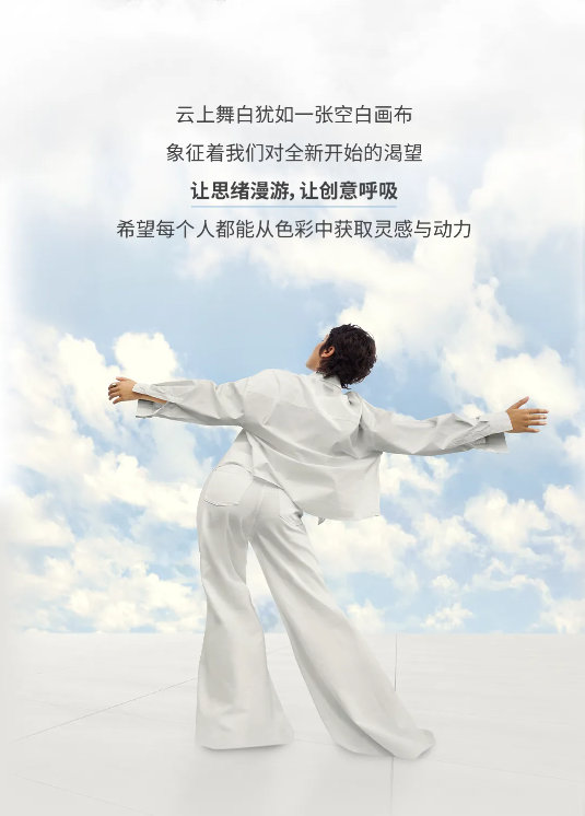 潘通色彩研究所指出,我们正处在一个“过渡的时代”。面对日益加速的生活节奏与持续不断的信息冲击,人们开始主动寻求身心的喘息空间,试图剥离干扰,找回内在的专注与平衡。“云上舞白”便是在这样的背景下应运而生。它如同一张空白的画布,象征着对全新开始的期盼;又似一声轻柔的耳语,在纷扰中传递出平和与宁静的力量。