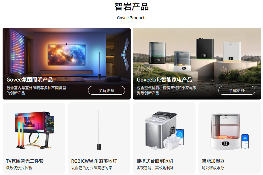官网显示,智岩科技成立于2017年,总部位于深圳南山区,CEO吴文龙为安克创新创始人之一,前安克创新CTO。智岩科技自诞生之初就专注于智能家居领域,尤其是以智能氛围照明为核心的产品研发与场景构建。目前智岩产品涵盖智能氛围照明系列、智能小家电系列,依靠自主研发和卓越的品质,产品畅销全球多个国家和地区,公司旗下智能硬件品牌Govee在全球多个市场占有率长期位于前列。