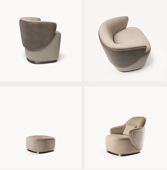 该系列延续了此前扶手椅的双层靠背结构,外靠背采用Visionnaire标志性的扇形绗缝软包工艺,并以皮质滚边勾勒轮廓。