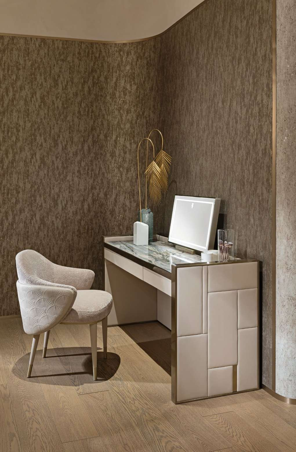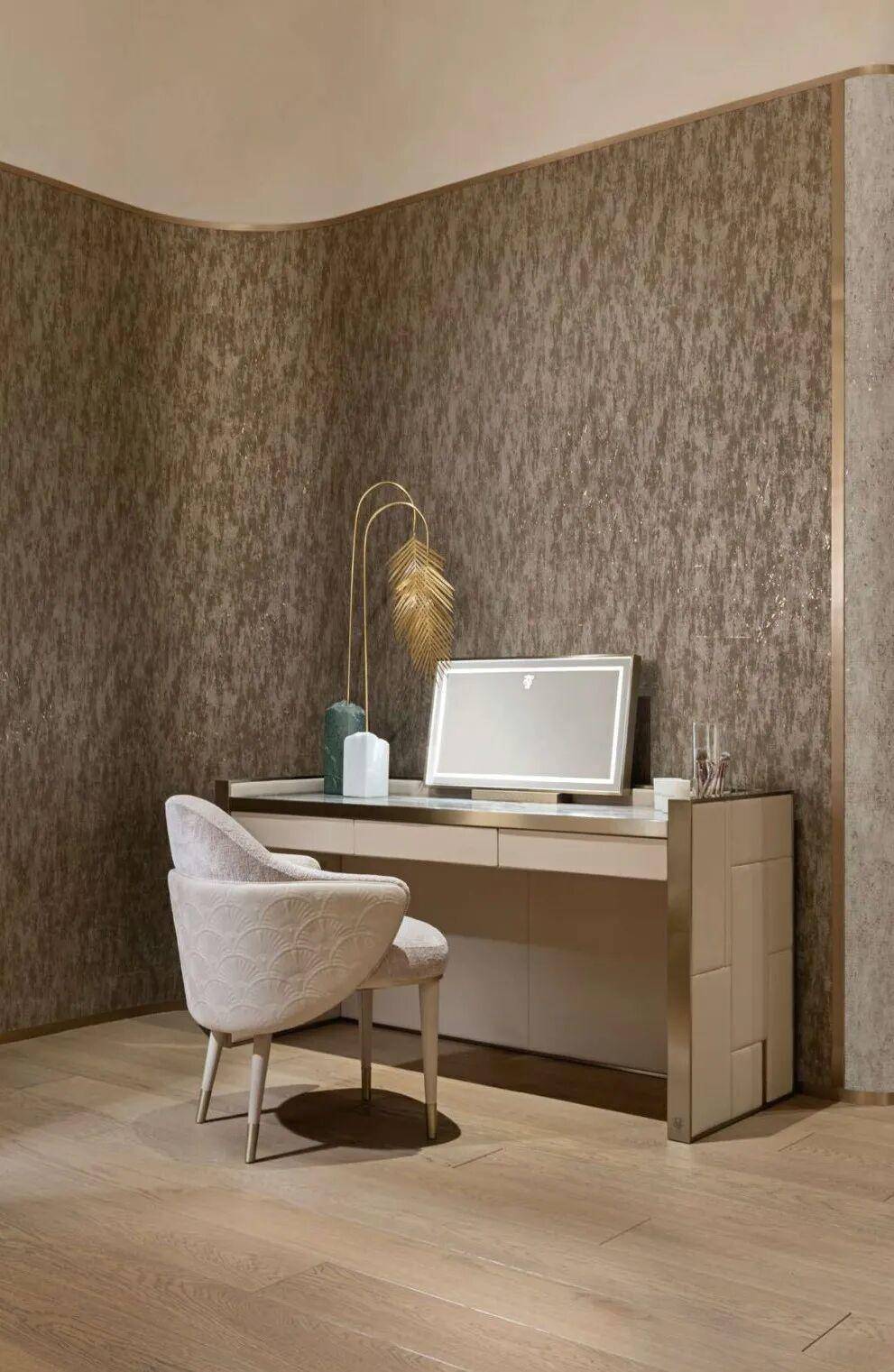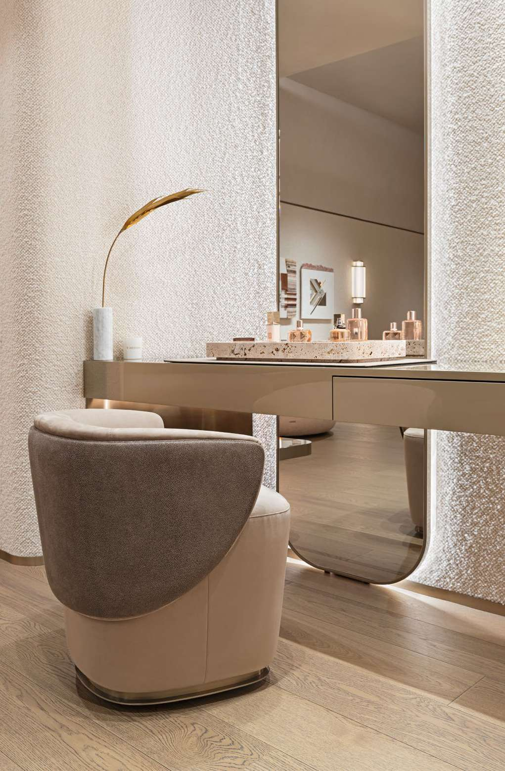 Adele系列的单椅与梳妆凳在Visionnaire展陈中,与同由Marco Piva设计的Tharis梳妆台、Abbey壁灯,以及Lafitte梳妆台等作品共同展出,构成完整的生活场景。此外,在品牌位于迪拜棕榈岛Villa Albero项目及越南独立门店等实案中,也能看到Adele扶手椅与品牌其他标志性产品和谐共处,展现了其在不同空间语境中的适配能力。