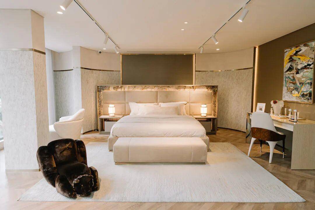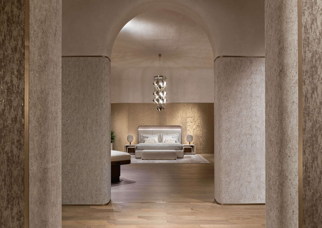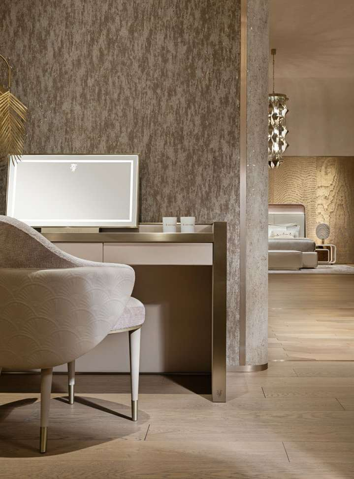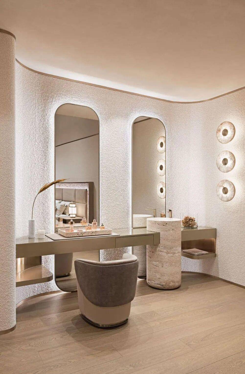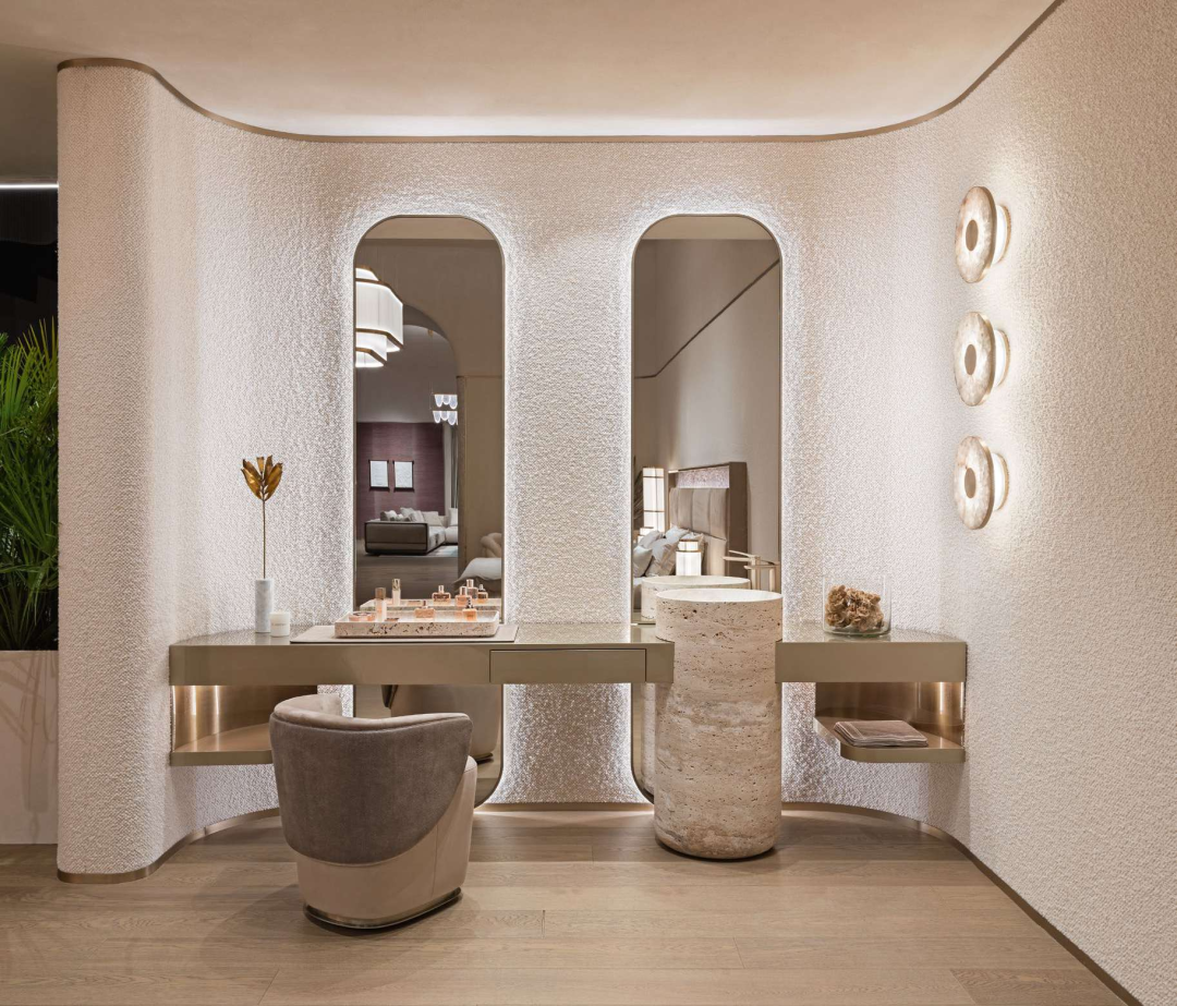 Adele系列的单椅与梳妆凳在Visionnaire展陈中,与同由Marco Piva设计的Tharis梳妆台、Abbey壁灯,以及Lafitte梳妆台等作品共同展出,构成完整的生活场景。此外,在品牌位于迪拜棕榈岛Villa Albero项目及越南独立门店等实案中,也能看到Adele扶手椅与品牌其他标志性产品和谐共处,展现了其在不同空间语境中的适配能力。