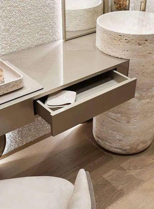 梳妆凳则配备可旋转金属底座,提供抛光与缎面两种表面处理及七种金属色调选择。外靠背同样饰以皮质滚边,扇形绗缝工艺可作为选配,坐垫与内外靠背均支持个性化面料搭配,体现出品牌对细节与定制可能性的重视。