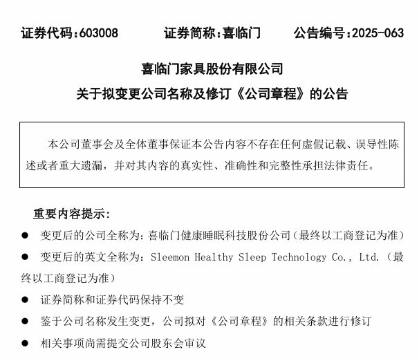 12月9日,喜临门家具股份有限公司(简称“喜临门”)发布公告称,董事会审议通过议案,拟将公司名称变更为“喜临门健康睡眠科技股份公司”,英文名称同步更新为“Sleemon Healthy Sleep Technology Co.,Ltd.”,证券简称与代码则保持不变。这一变更尚待股东大会审议及工商登记核准。