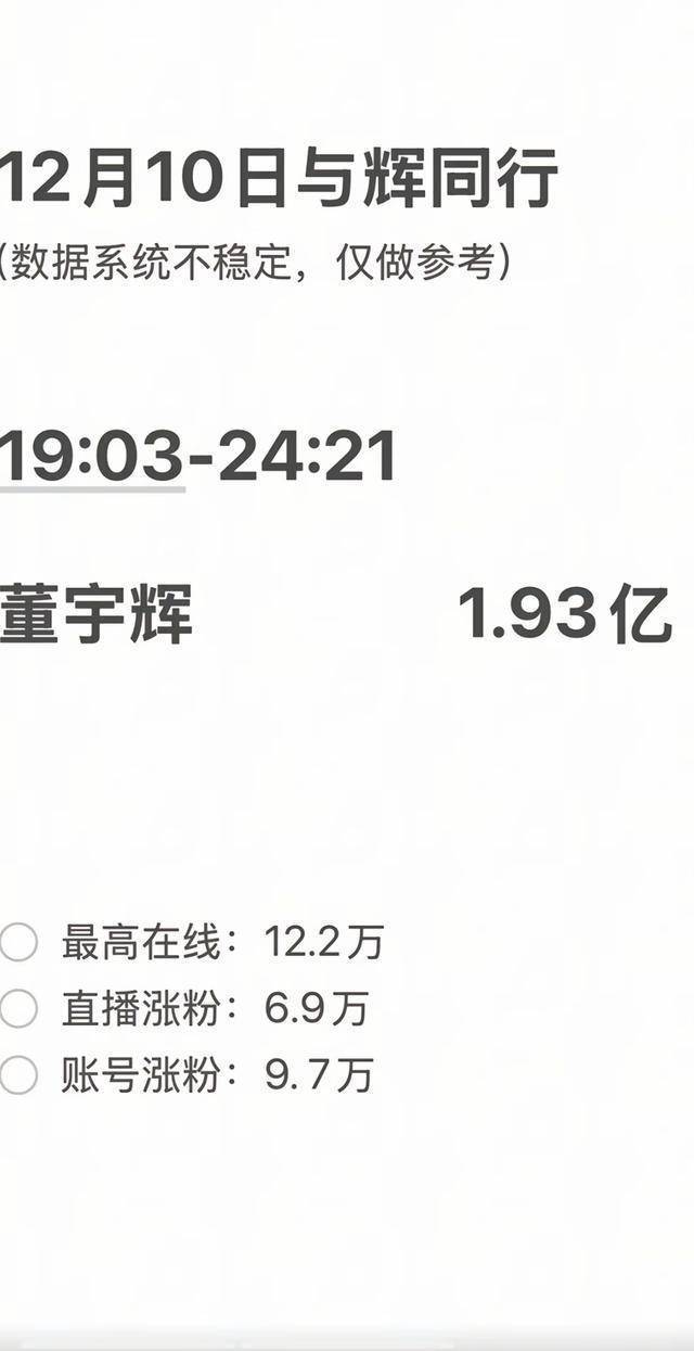 这场从清晨延续至午夜的直播马拉松,清晰地展现了“与辉同行”当前强大的销售势能与高度成熟的团队协作模式。从早上7点45分董董与盼盼开播即迎来10万在线观众开始,直播间全天维持着高热度的“爆卖”节奏。至中午12点,销售额已迫近亿元;而当董宇辉于晚间7点提前接班时,当日业绩已累积至1.63亿元。在其个人主导的近五个半小时直播时段内,他贡献了约1.93亿元的销售额,成为拉动全天业绩的核心引擎。