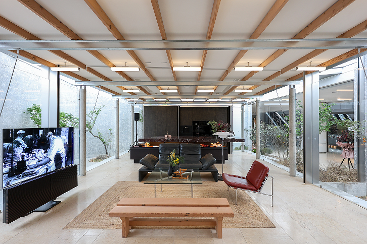 全新的中国旗舰展厅设计灵感源自建筑大师密斯·凡德罗的范斯沃斯住宅——那座坐落于福克斯河畔的玻璃建筑,以极简的几何构成、通透的钢架与光影交织的空间而闻名。Goeif在此汲取其“少即是多”的精神,提出“引自然入境、重塑奢华定义”的空间哲学。在设计中,Goeif尝试模糊展厅与生活场景的界限。这里不仅是产品展示的场所,更是一个能感受到生活气息的场景化空间。自然、光影与工艺在此交融,每一处细节都服务于人本体验。