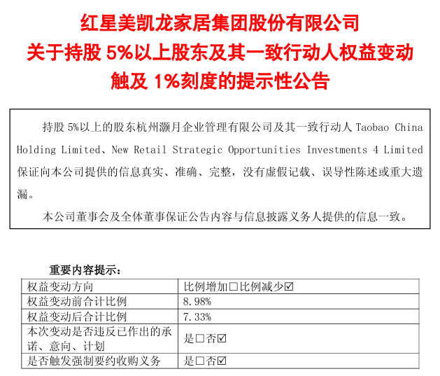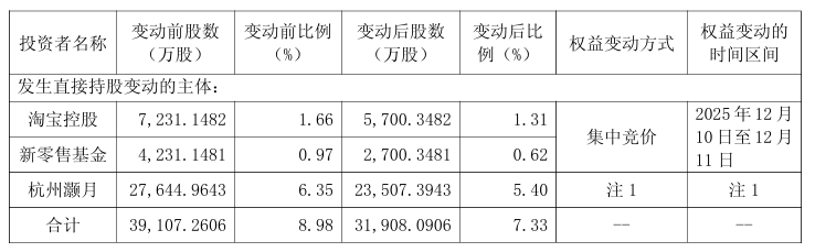 此次减持后,持股5%以上股东杭州灏月及其一致行动人(包括淘宝控股及新零售基金)合计持有公司股份数量由约3.91亿股减少至约3.19亿股,持股比例由8.98%降至7.33%,权益变动触及1%整数倍的披露标准。