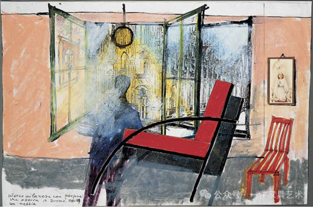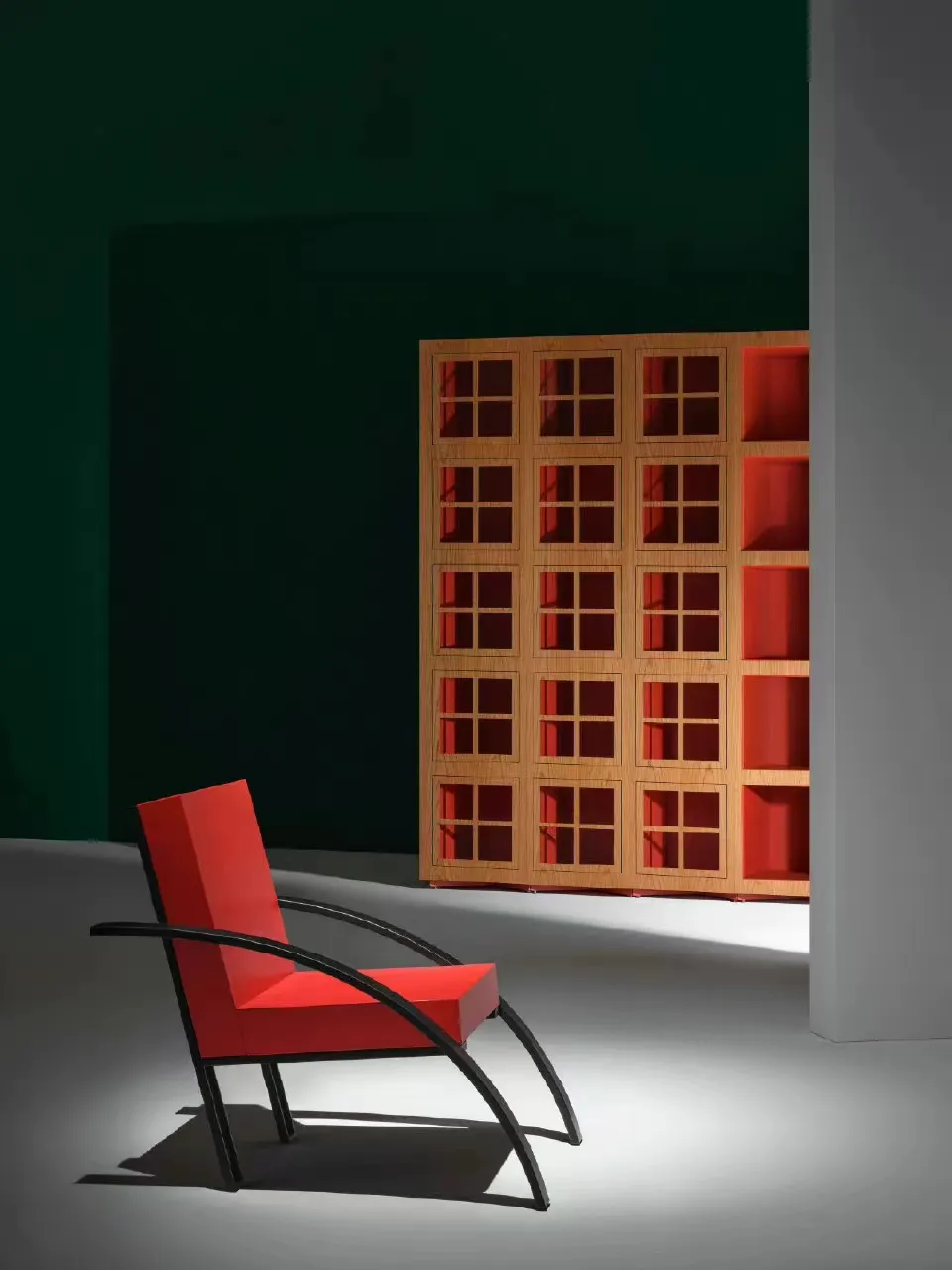 彼时的意大利家具设计,正逐渐从纯粹的功能主义转向更具人文关怀的表达。作为建筑师,罗西不满足于冰冷的逻辑结构,他希望家具也能如建筑一般,承载记忆与情感。Parigi正是这种理念的延伸——它不依赖多余的装饰,却在极简的形态中蕴藏着属于城市的诗意。有人说,它像一座“可坐的建筑”,其深邃的黑、稳重的红,恰如罗西建筑作品中常见的砖墙与屋顶的色彩。在他的建筑中,形式是记忆的容器;而在Parigi椅中,形式则化为身体的庇护所。