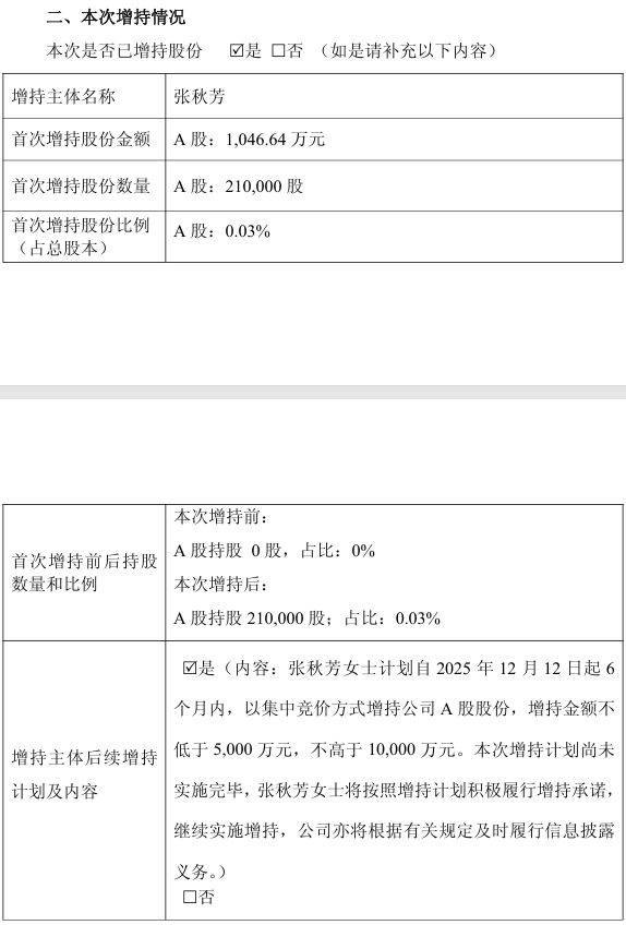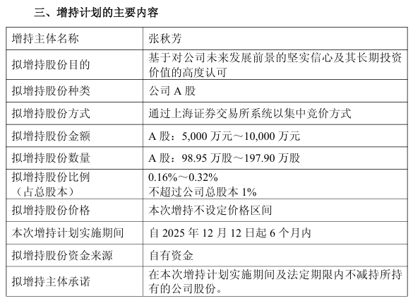 这并非一次简单的增持。公告同时披露了后续增持计划:自12月12日起六个月内,张秋芳女士计划继续通过集中竞价方式增持98.95万股-197.90万股公司股份,累计增持金额不低于5000万元、不超过1亿元。在当前市场环境下,实际控制人家庭以实际行动支持公司发展,展现出对企业未来前景的坚定看好。