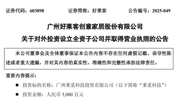 12月13日,好莱客发布公告,宣布以自有资金人民币5,000万元设立全资子公司广州莱觅科技投资有限公司,并于12月11日完成工商登记,正式取得营业执照。此次投资属于公司董事长审批权限范围内,无需提交董事会审议,且不构成关联交易或重大资产重组。