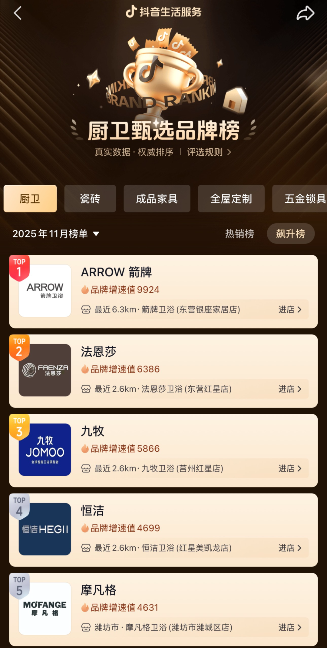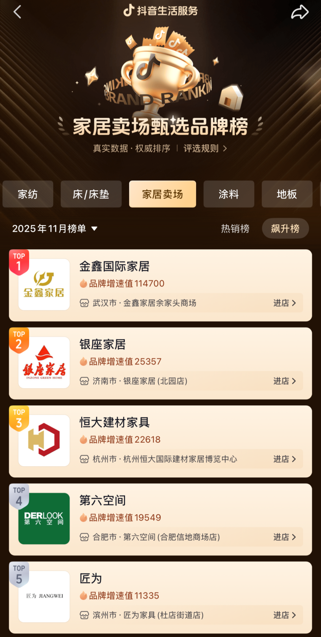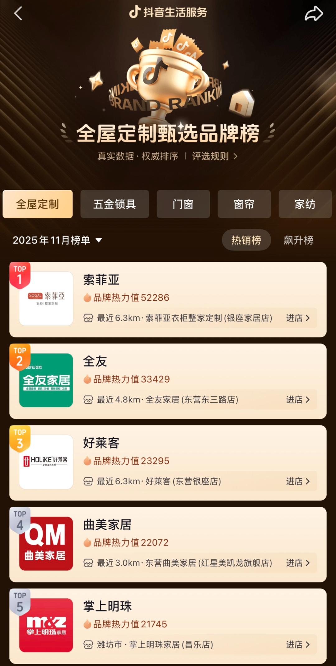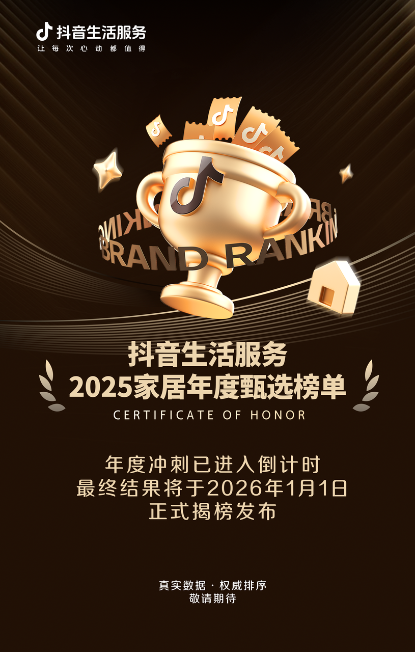 值得关注的是,随着年度收官临近,抖音生活服务家居行业即将于2026年1月初发布更具份量的《2025年度甄选品牌总榜》。相较于月度榜单,年度榜单将更全面地考察品牌在全年的交易规模与综合经营实力,对各细分品类进行系统评估。这不仅是对品牌年度成绩的一次集中检阅,也将进一步帮助品牌实现生意持续增长与行业声量爆发,或将为家居行业的线上竞争格局带来新的定义。