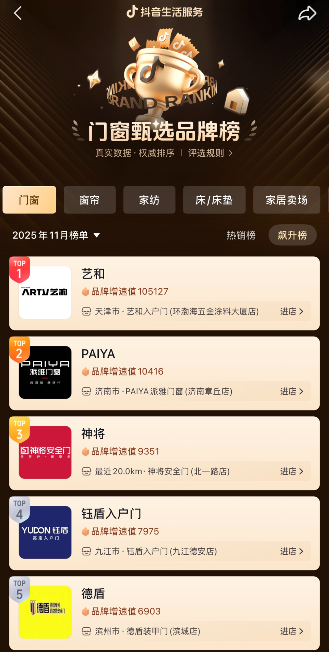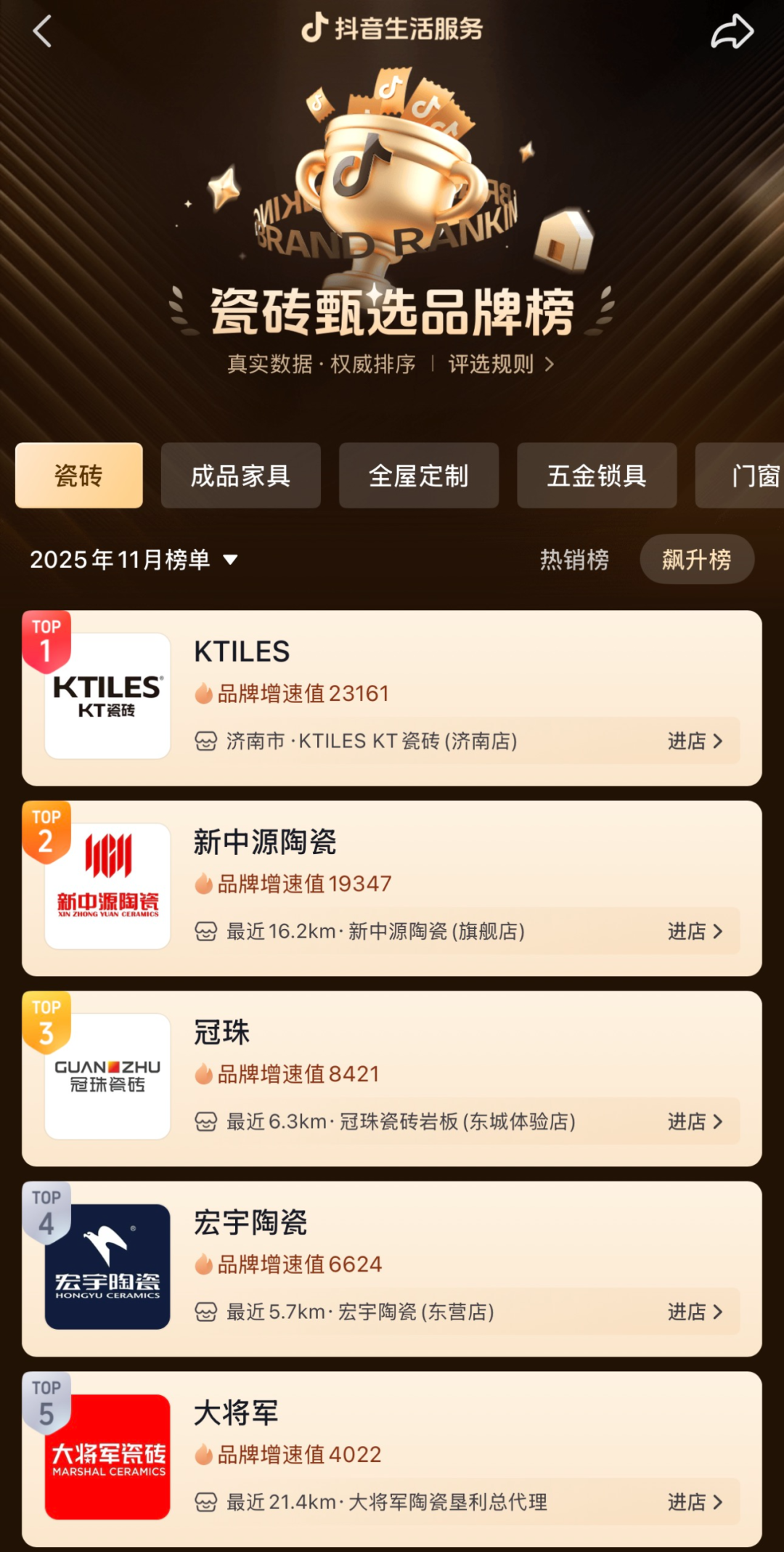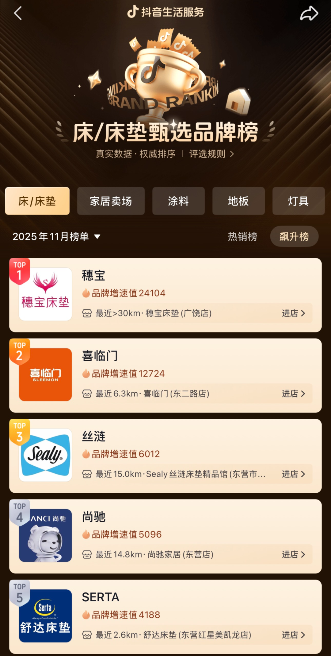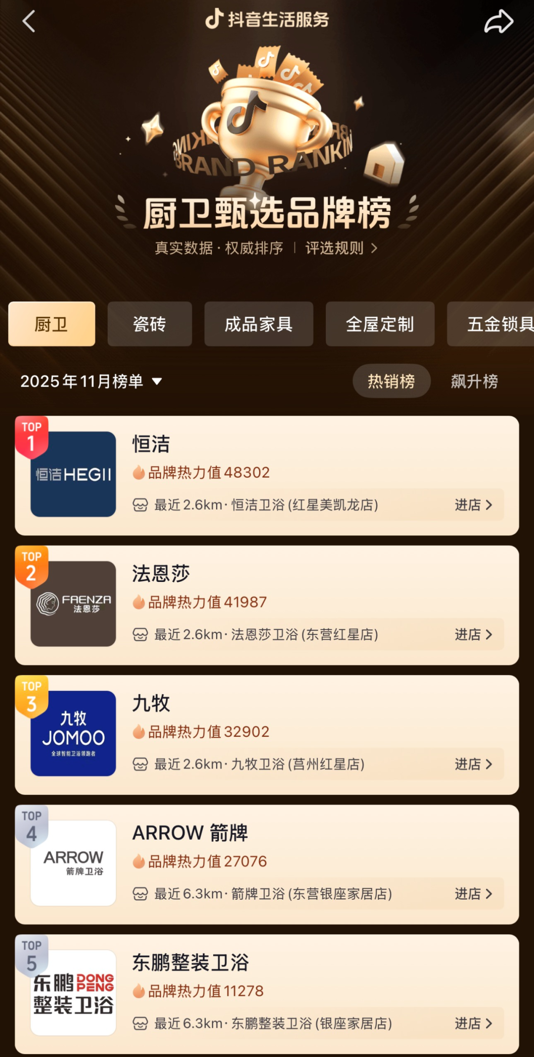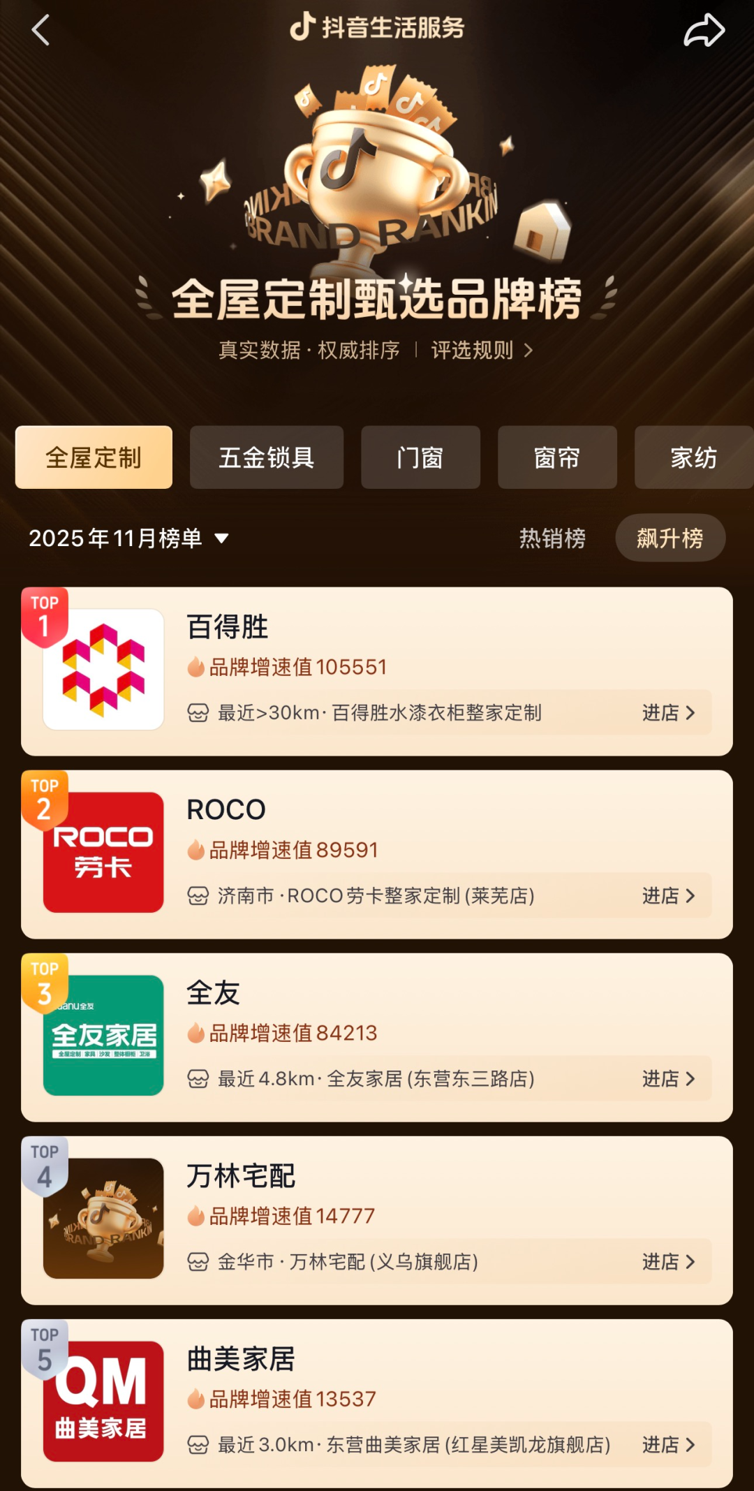 值得关注的是,随着年度收官临近,抖音生活服务家居行业即将于2026年1月初发布更具份量的《2025年度甄选品牌总榜》。相较于月度榜单,年度榜单将更全面地考察品牌在全年的交易规模与综合经营实力,对各细分品类进行系统评估。这不仅是对品牌年度成绩的一次集中检阅,也将进一步帮助品牌实现生意持续增长与行业声量爆发,或将为家居行业的线上竞争格局带来新的定义。