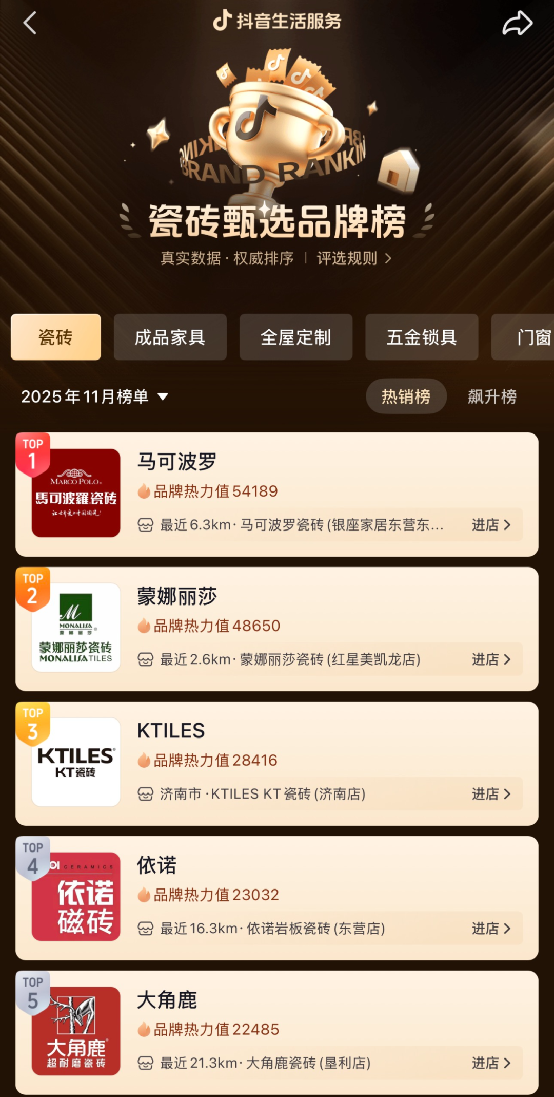 11月,抖音生活服务家居行业甄选品牌月度榜单如期揭晓,这已成为观察家居消费市场线上化趋势与品牌竞争格局的重要窗口。本次榜单覆盖了从成品家具、厨卫洁具、全屋定制到家纺、门窗、窗帘等13个核心类目,通过“热销榜”与“飙升榜”两条赛道,既展现了如源氏木语、马可波罗、索菲亚等行业领跑者的持续影响力,也呈现出乐至宝、狄普等新锐品牌快速崛起的活力。
