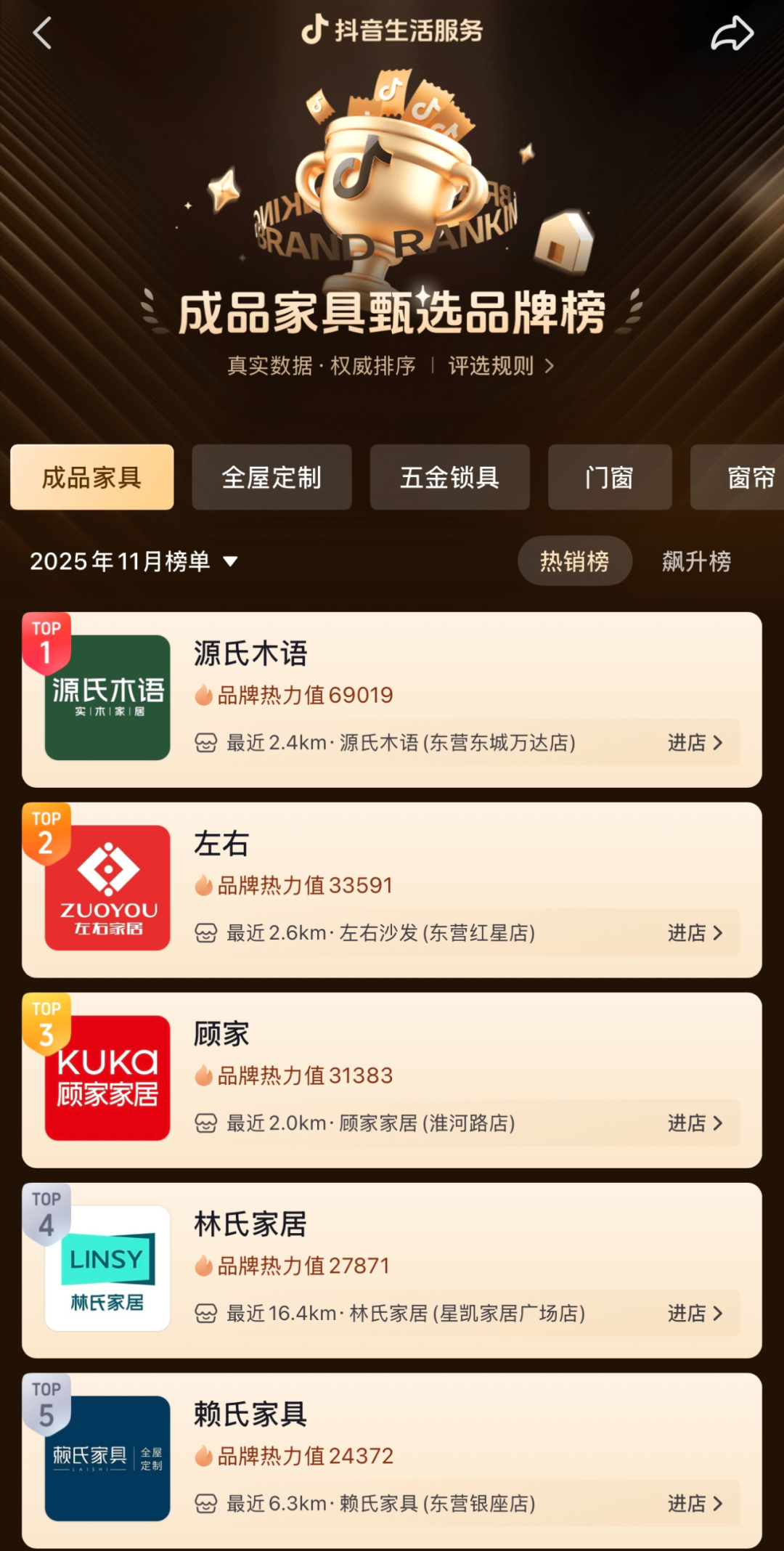 抖音家居行业11月甄选品牌榜:源氏木语、尚驰、索菲亚领跑行业