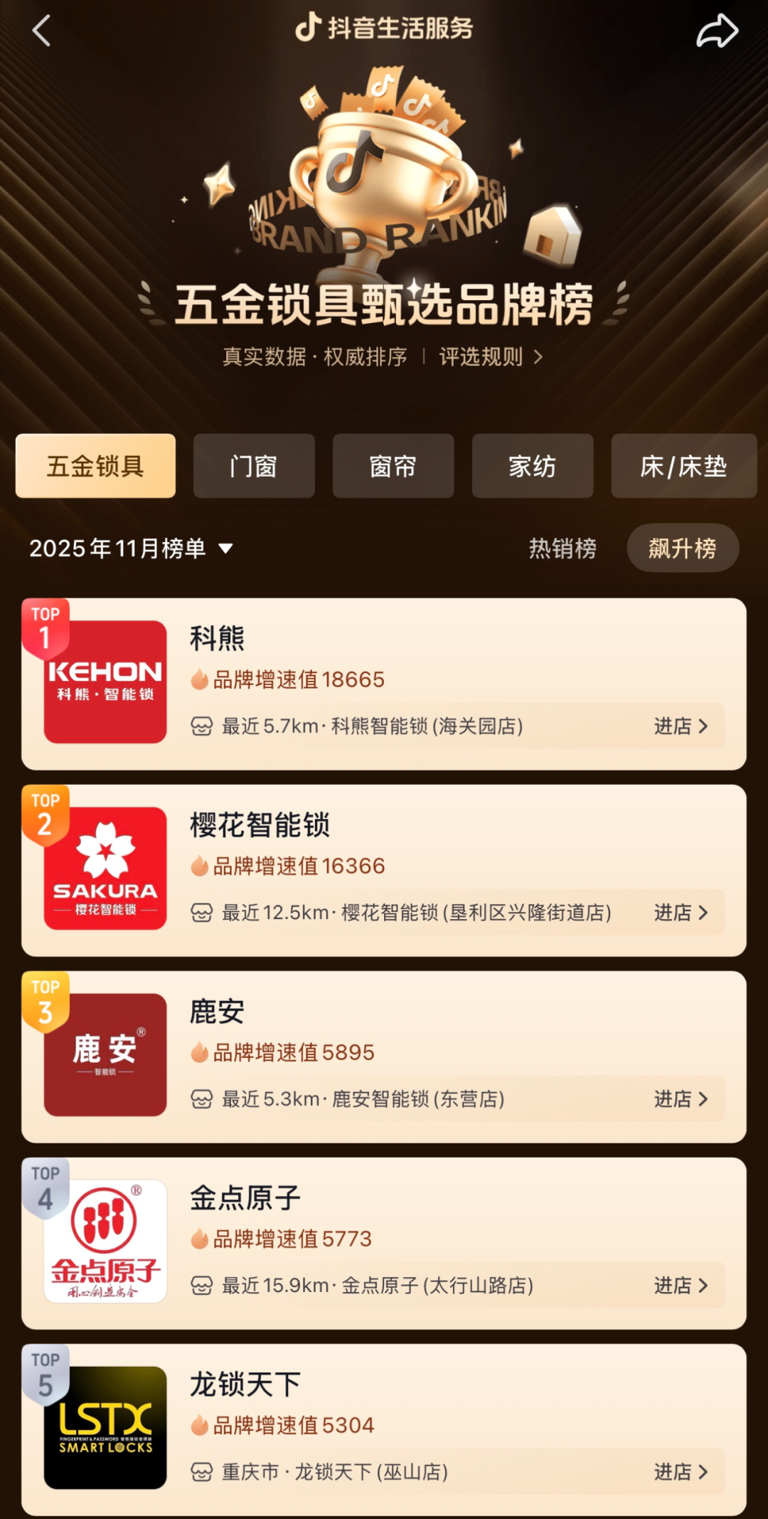 与此同时,“飙升榜”则成为了观察市场新动向与品牌增长潜力的关键窗口。榜单中涌现出一批增速显著的新锐品牌或区域强势品牌,如五金锁具领域的科熊、樱花智能锁,成品家具类的乐至宝、狄普,以及全屋定制领域的百得胜、劳卡等。这些品牌或通过智能化、设计差异化切入细分市场,或借助高效的线上营销与本地化服务实现快速起量,展现出在家居存量市场竞争中“弯道超车”的活力。