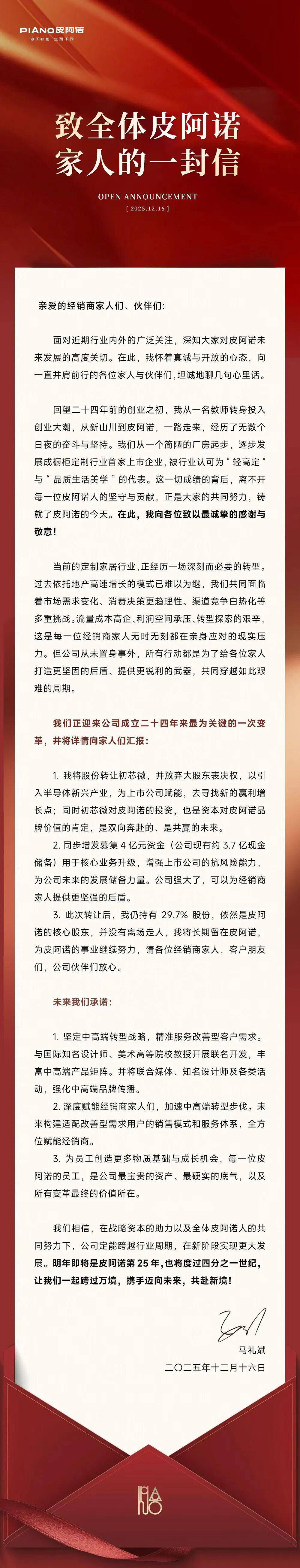 12月16日晚间,皮阿诺创始人马礼斌通过一封《致全体皮阿诺家人的一封信》,首度正式回应了近期备受关注的股份转让与控制权变更事件。他在信中强调自己“没有离场”,并系统地阐述了这场被视为公司成立二十四年来“最为关键的一次变革”的战略意图与实施路径。
