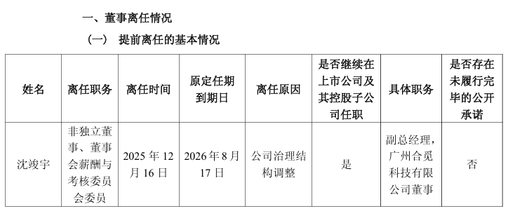 公告显示,公司非独立董事沈竣宇于12月16日向董事会递交书面辞职报告,辞去其担任的公司非独立董事及董事会薪酬与考核委员会委员职务。公司方面表示,沈竣宇的离任系公司根据《公司章程》进行的正常治理结构调整,其本人将继续在公司担任副总经理,并在控股子公司广州合觅科技有限公司担任董事,因此本次变动不会对公司的正常生产经营产生影响。