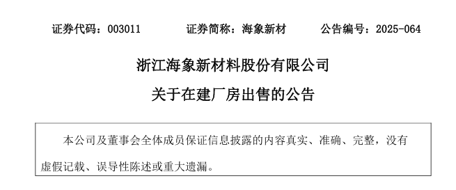 国内订单流失冲击波,海象新材叫停在建厂房并出售。