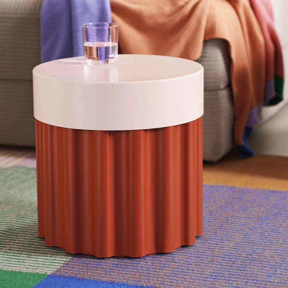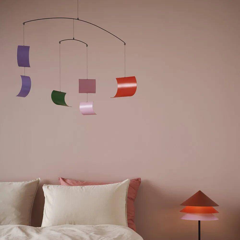 该系列亦注重材质与造型的创意结合。波纹钢板制成的收纳边桌采用雾粉与棕红双色搭配,形如精致甜点,既是边桌也可用作收纳。悬挂式吊饰则由多片微弯的彩色金属片组成,随气流轻轻转动,捕捉光线并折射出微妙色彩变化,如同一件动态的空间雕塑。
