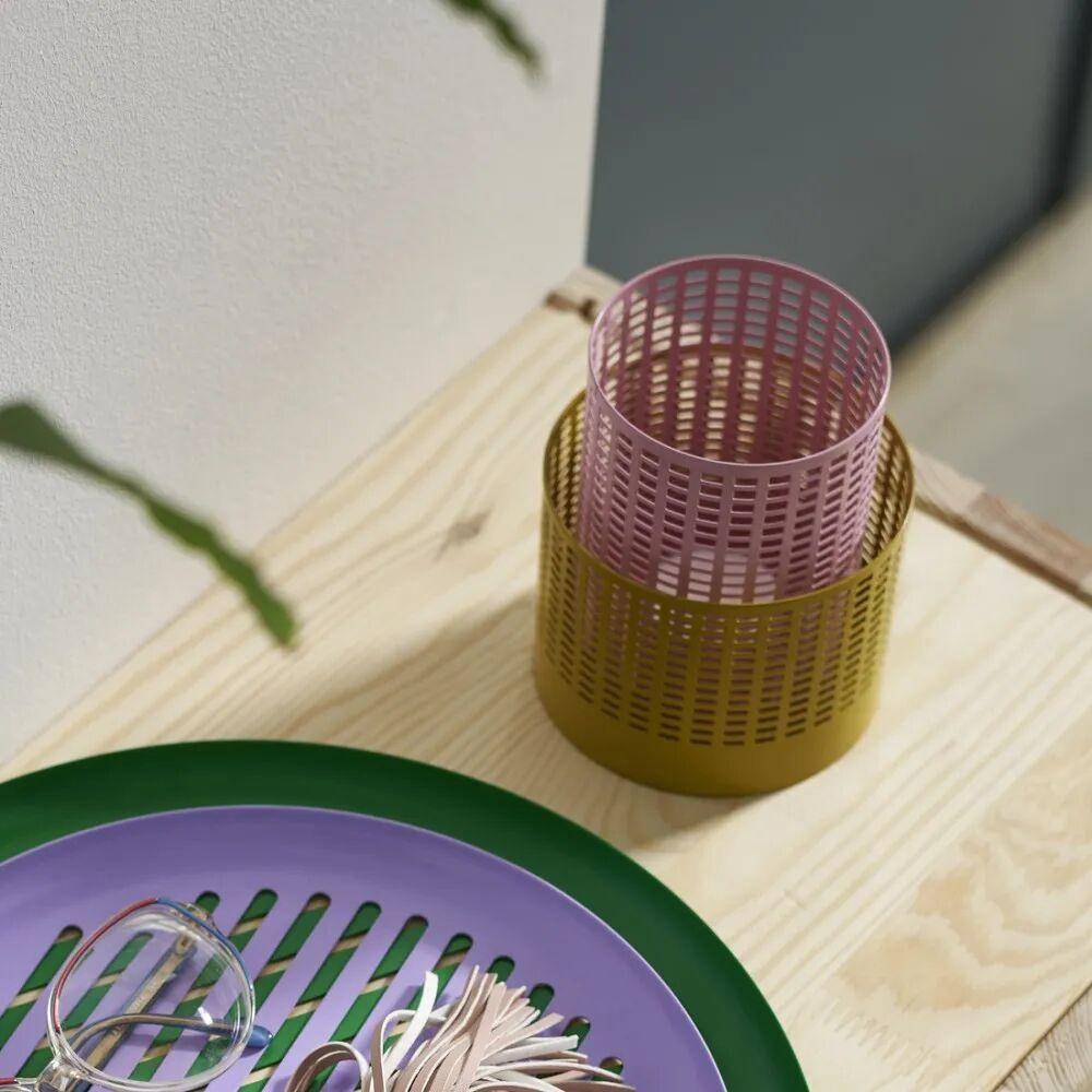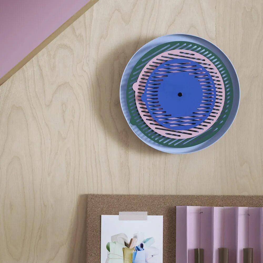 TESAMMANS系列共包含17款产品,运用多达15种色彩,并融合金属、织物、玻璃等多元材质,突破传统家居设计的视觉框架。例如带有镂空设计的移动推车,不仅以渐变的粉、橙与芥黄色营造和谐层次,更通过侧面的条纹镂空在移动时产生独特的莫列波纹效应,在实用功能中融入动态视觉趣味。同样打破常规的还有三层钟盘叠合而成的时钟,它以草绿、粉红与宝蓝构成,边缘半圆形突起替代传统指针,随着时间流转,钟盘上的镂空线条交错形成持续变化的图案,成为一件兼具功能与艺术感的家居摆件。