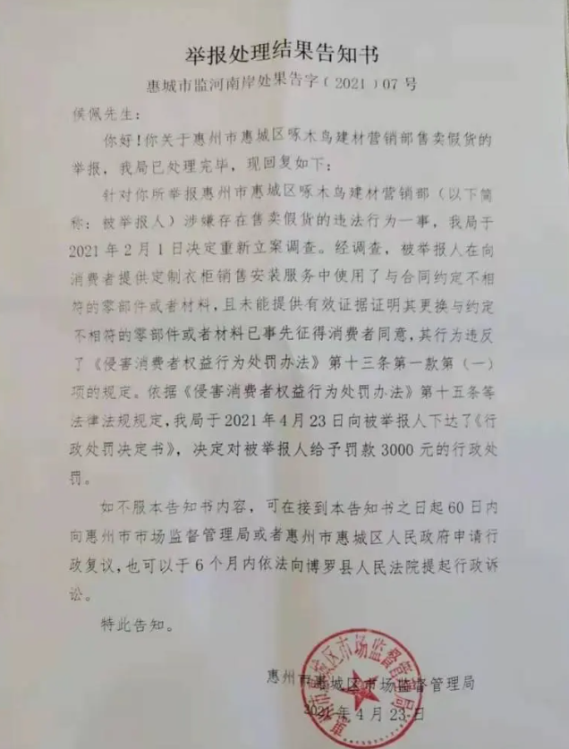 2020年6月12日,侯先生向惠城区市场监督管理局提交了《关于惠州市惠城区啄木鸟建材营销部售卖假货的举报信》,投诉其提供的定制家具及五金配件涉嫌掺杂、掺假,以假充真、以次充好。