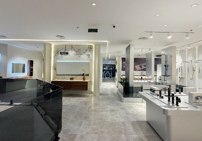 步入展厅,访客能立即感受到以沉浸式体验为核心的设计理念。空间系统性地陈列了九牧的全系列产品,其中智能马桶及相关核心科技解决方案被置于突出位置。尤为重要的是,展厅并非简单复制全球统一形象,而是深度融合了沙特本地的审美偏好与使用习惯。通过打造多个完整的卫浴场景套间,设立花洒龙头试水区、五金选购区、淋浴房展示区以及专门的定制浴室柜专区和服务洽谈间,九牧旨在为当地消费者提供从直观产品体验到个性化定制方案的一站式专业服务。