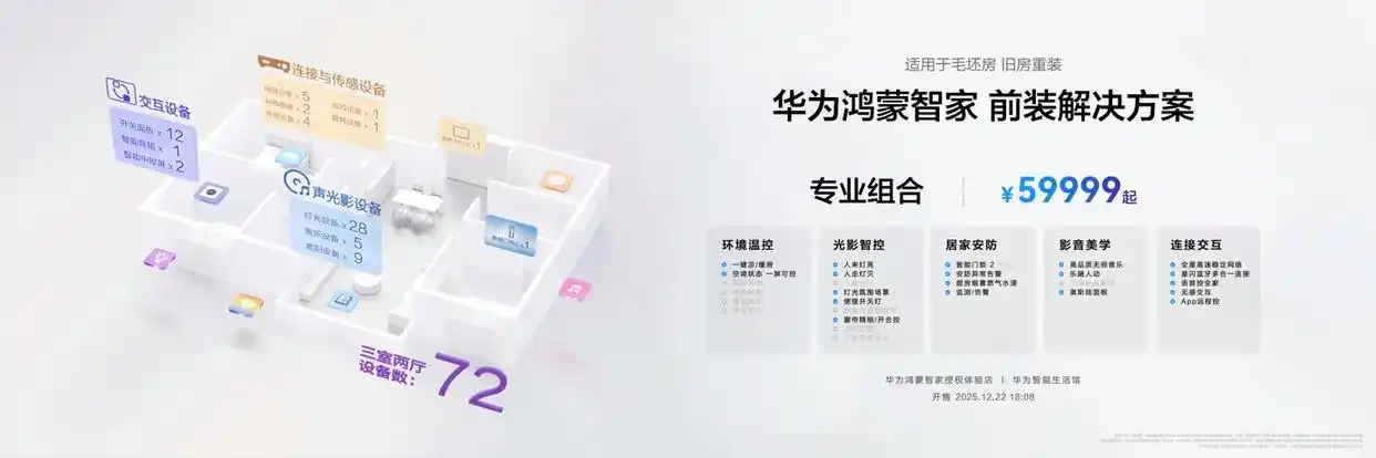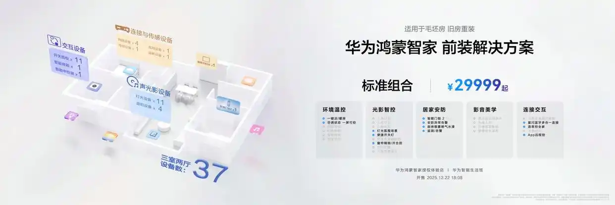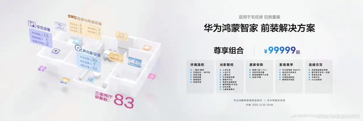 12月22日,深圳华为nova 15系列及全场景新品发布会现场,鸿蒙智家发布全新空间智能化解决方案,推出覆盖前装、后装两大场景的六档智装套餐,后装套餐最低门槛下探至9999元。