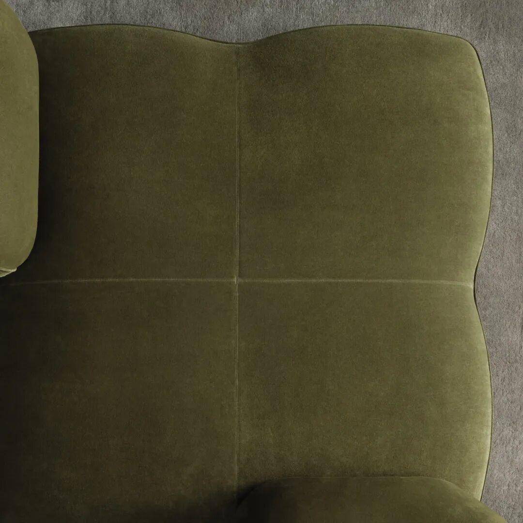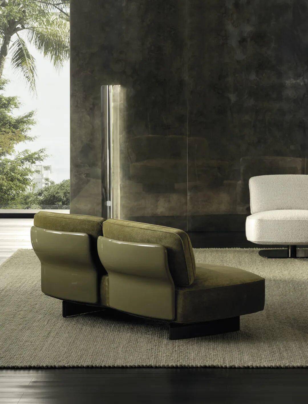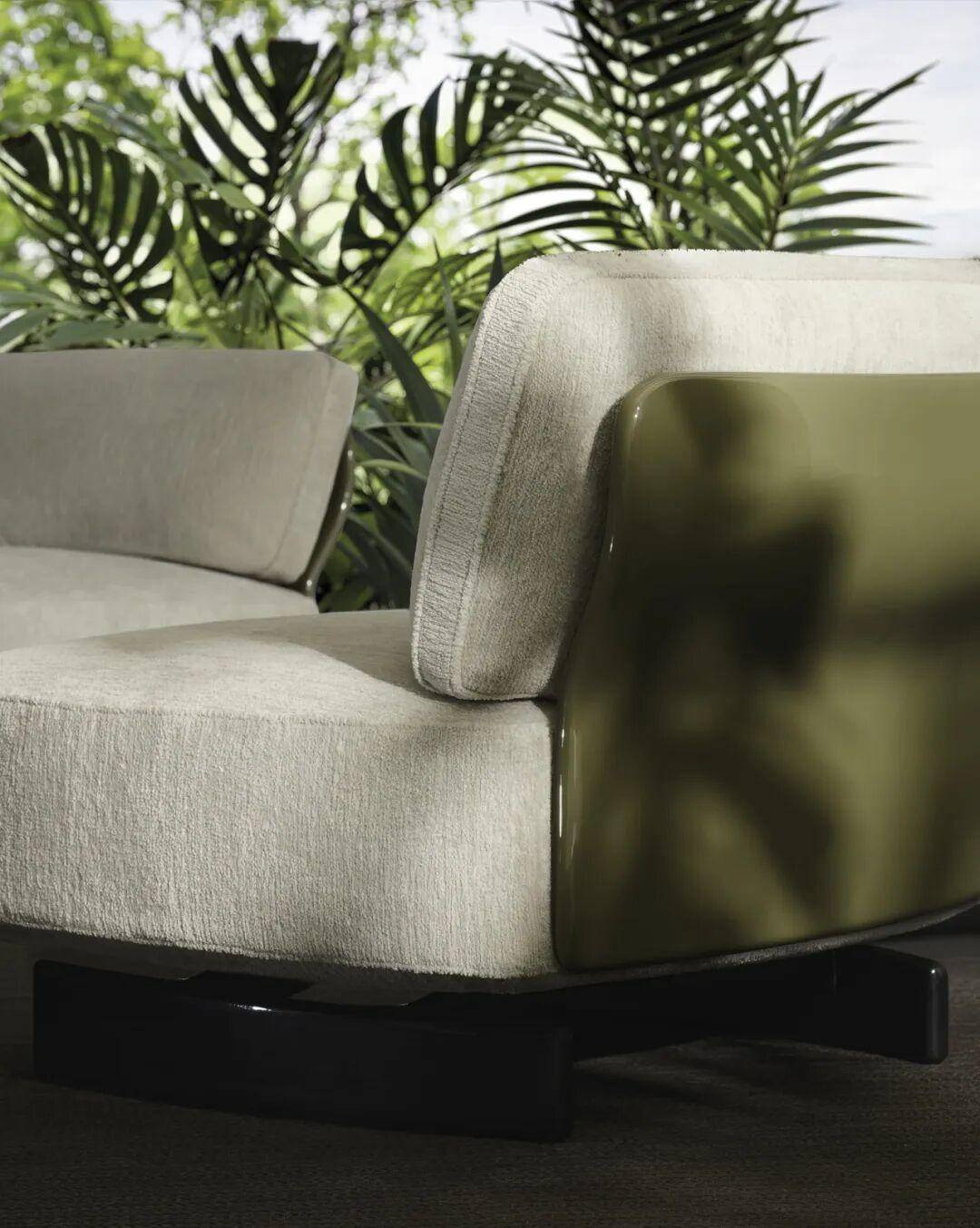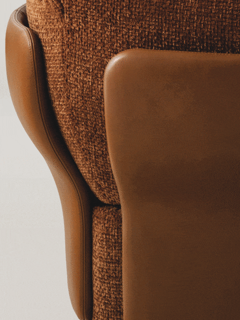 Saki室内系列将自然意象与Minotti的高端工艺细腻结合,以流畅的形态与精致的细节,重新诠释当代室内家具的优雅。其美学的核心,在于对“花朵绽放”的意象进行抽象转译与升华。靠背与扶手以舒展的曲线从底部向上延伸,如同花瓣在光照下缓缓打开;靠背后立体包裹的皮革面板,则如花萼般温柔承托。曲线既经人体工学的细致推敲,确保舒适,亦在视觉上营造出温暖包容的氛围。宽大座面与圆润轮廓,饰以精细镶边,兼顾柔和的造型与高级的质感。边角软垫上方的缝线细节,在细腻与柔软之间取得平衡,看似不经意,却透露出Nendo对“细节美学”的极致追求。