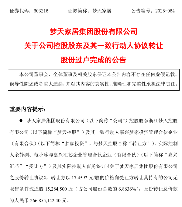 梦天家居6.86%股份协议转让过户完成,控制权保持不变