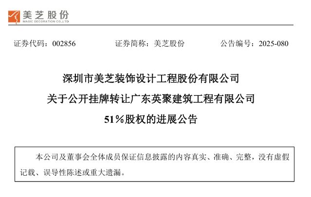 在建筑工程行业竞争持续、部分企业面临业务调整的背景下,上市公司通过产权交易平台剥离非核心或效益不佳的资产,成为优化资产结构的一种常见举措。此次美芝股份以公开挂牌方式完成对英聚建筑控股权的转让,既体现了交易过程的公开透明,也反映出公司在当前市场环境下聚焦主业、控制风险的经营思路。