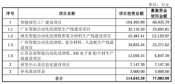 根据募资规划,公司拟投入约6.69亿元用于广东、湖北、广西、江苏四地的智能绿色工厂建设项目,旨在扩大浸渍纸、复合材料及人造板产能,并引入EB电子束生产线拓展特种材料应用;另计划投入7147万元建设研发中心及信息化系统,并补充流动资金3000万元。若成功上市,募投项目的实施有望进一步巩固其在环保饰面材料领域的产能与技术优势。