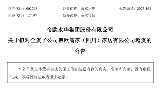 在寻求多元化发展的家居建材企业中,业务板块的整合与独立正成为一股新趋势。12月31日,帝欧水华集团发布公告,宣布了一项重大的内部资产重组计划。公司拟将旗下核心卫浴业务——“帝王”品牌相关的全部资产、业务及人员进行整合,整体注入至一家新成立的全资子公司中,旨在打造一个独立运营的卫浴产业平台。根据公告,此次资产注入将通过增资形式完成,总规模高达2.4亿元,标志着帝欧水华对其四大业务板块的管理架构进行了一次深度重塑。