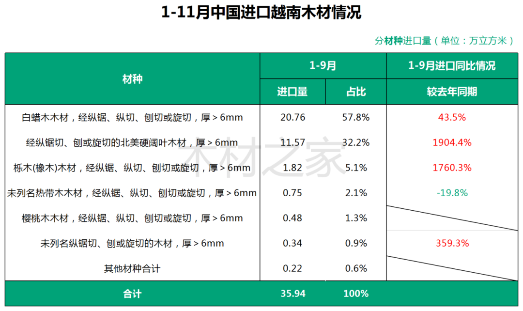 从全年进口情况分析,中越木材贸易呈现大幅增长态势,主要归因于白蜡以及北美硬阔叶锯材进口数量的增加。