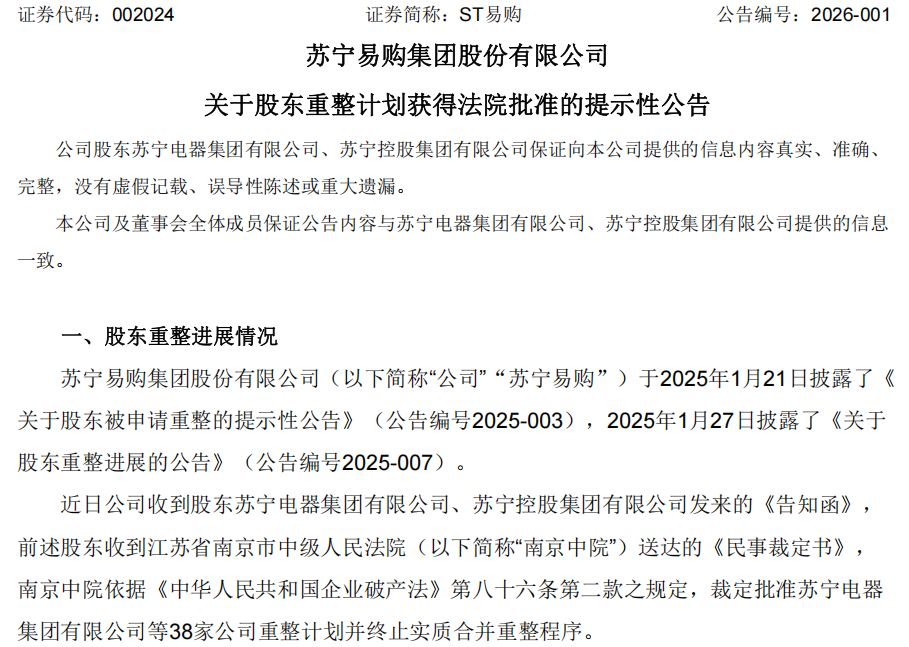 1月5日,ST易购(原简称“苏宁易购”)发布《关于股东重整计划获得法院批准的提示性公告》。公告提及,近日公司收到股东苏宁电器集团有限公司、苏宁控股集团有限公司发来的《告知函》,前述股东收到江苏省南京市中级人民法院(以下简称南京中院)送达的《民事裁定书》,南京中院依据《中华人民共和国企业破产法》第八十六条第二款之规定,裁定批准苏宁电器集团有限公司等38家公司重整计划并终止实质合并重整程序。