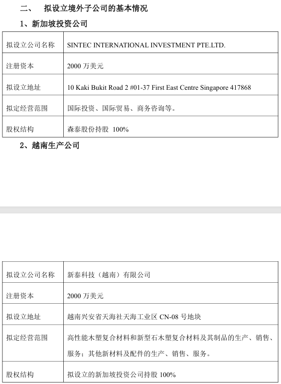 公告显示,公司已于2026年1月5日召开董事会审议通过了相关议案。根据计划,公司将在新加坡设立全资投资子公司,并由该子公司投资在越南兴安省天海工业区设立生产型全资子公司,负责土地购置、厂房建设及设备采购。两家拟设公司的注册资本合计不超过2000万美元。越南生产基地将专注于高性能木塑复合材料和新型石木塑复合材料的生产与销售。