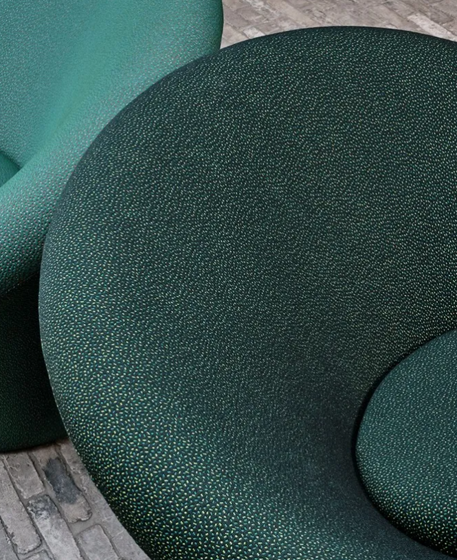 蘑菇椅的内部为轻质钢架结构,外层覆以高密度泡沫,并以整张弹性织物进行无缝包裹。这一工艺源自保林与荷兰家具制造商Artifort在1958年启动的联合研发,其突破性在于彻底告别了传统钉接与拼缝方式,通过一体成型的覆盖技术,使椅子在视觉上呈现连续、柔滑的整体感。在当时仍普遍依赖手工细作的时代,这一制作方式不仅提升了座椅的美学完整性,也推动了家具产业在材料与工艺上的现代化进程。