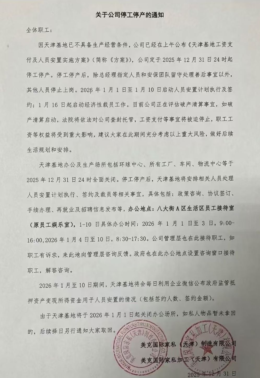 与资本市场火热形成反差的是,近日,一份落款为美克国际家私(天津)制造有限公司及美克国际家私加工(天津)有限公司的停工停产通知在互联网流传。