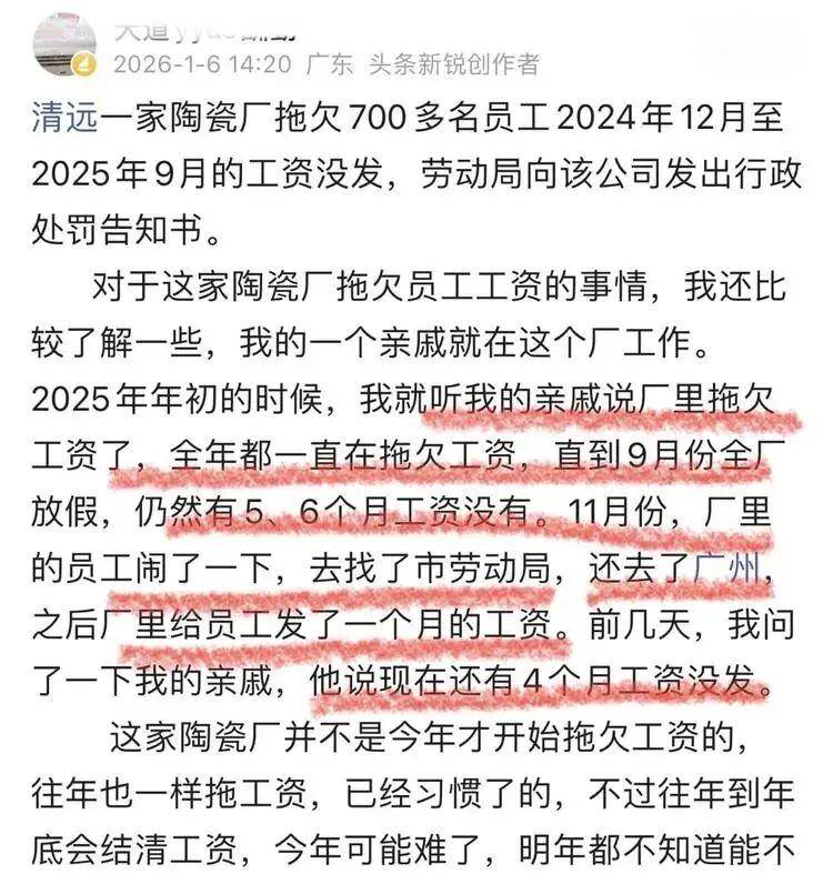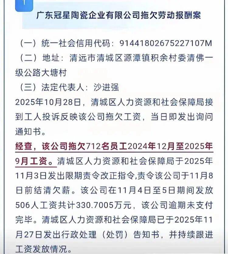近日,清远一家陶瓷厂因拖欠700多名员工2024年12月至2025年9月工资一事,引发社会广泛关注。根据清城区人力资源和社会保障局发布的案件通告,广东冠星陶瓷企业有限公司自去年年底起便存在欠薪行为,涉及员工达712人。尽管劳动部门已多次介入并发出责令改正指令,该公司至今仍未完全结清工资,仅发放了506人共计约330.7万元,剩余款项依然悬而未决。