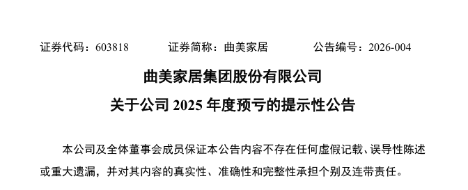1月11日晚间,曲美家居发布2025年度预亏公告,经初步测算,预计全年利润总额、归属于上市公司股东的净利润及扣非净利润均为负值。这已是这家以中高档民用家具为主业的公司连续第四年扣非净利润录得亏损。