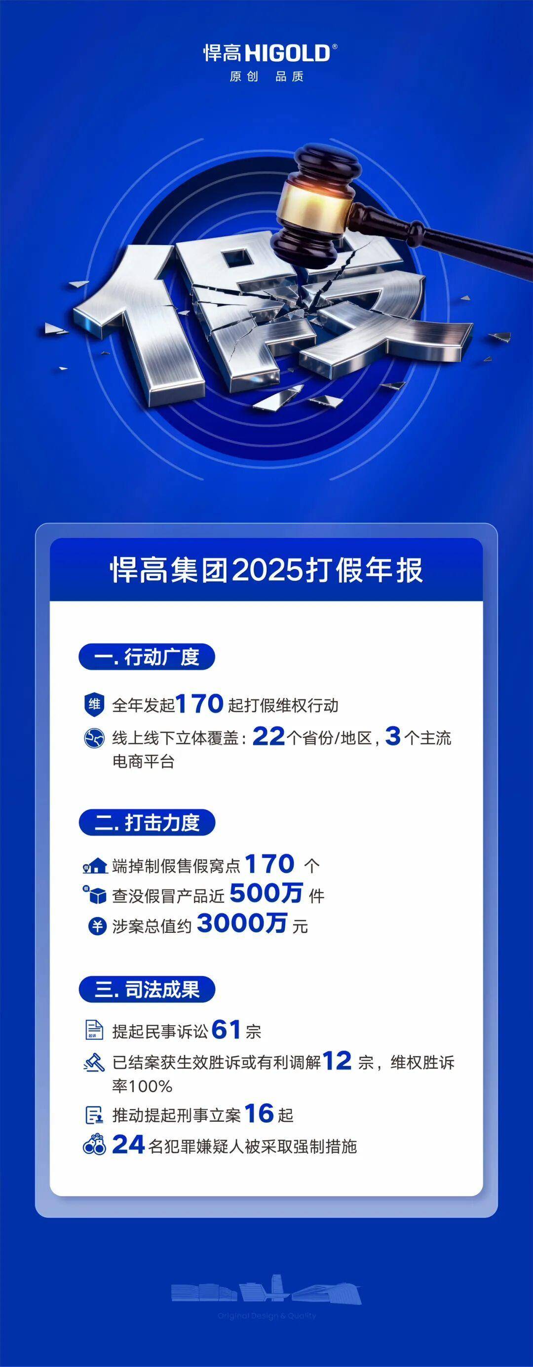 在司法维权层面,悍高全年发送各类法律文书超百份,提起民事诉讼61宗,已结案的12宗案件均以胜诉或达成有利调解告终。同时,品牌向公安机关移送并配合刑事立案16起,已有24名犯罪嫌疑人被依法采取强制措施,显示出从民事追责到刑事打击的全链条维权力度。