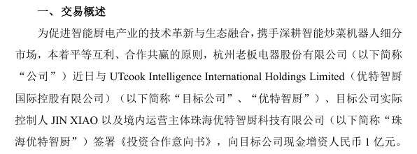 1月12日晚间,老板电器发布公告,宣布与UTcook Intelligence International Holdings Limited(优特智厨国际控股有限公司)及其相关方签署《投资合作意向书》,拟以现金形式向目标公司增资人民币1亿元。此举标志着这家厨电龙头企业正以资本为纽带,正式切入商用智能炒菜机器人赛道,寻求在AI烹饪时代构建新的增长曲线。