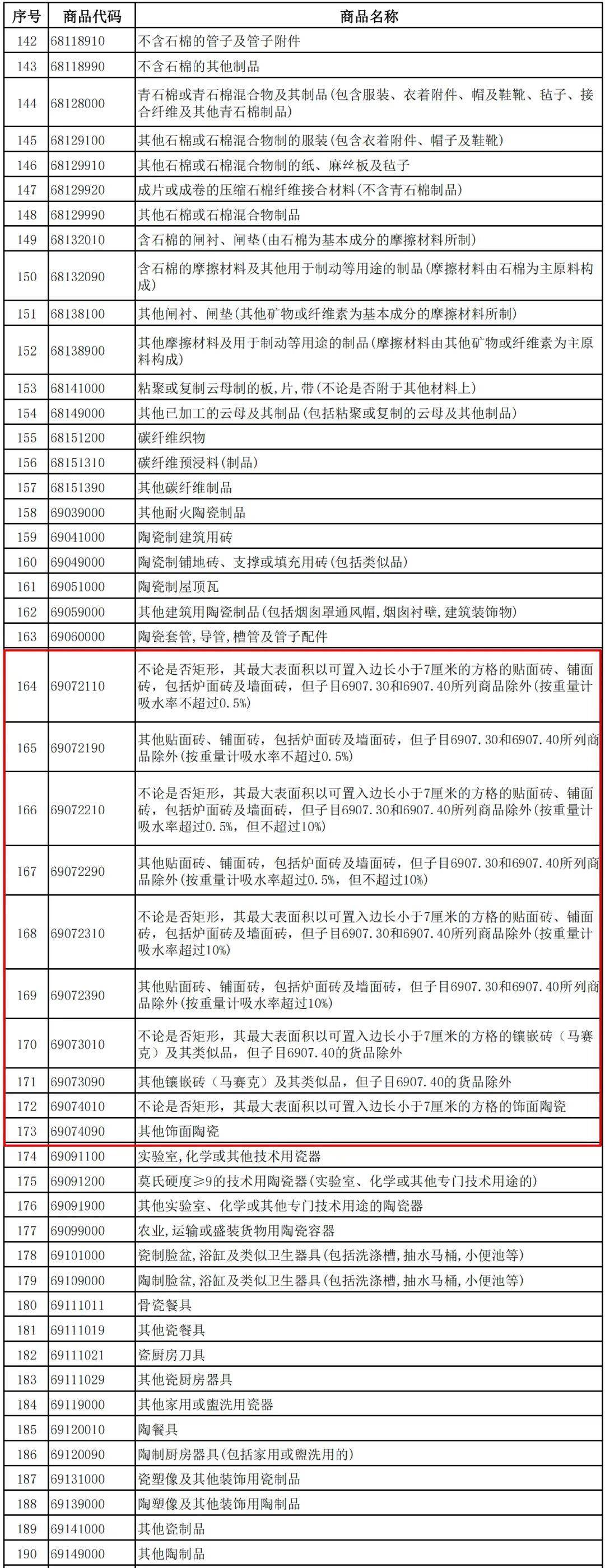 政策覆盖HS编码6907项下全段产品,常规瓷砖、陶瓷大板、岩板,以及马赛克与饰面陶瓷等,全部在调整之列。